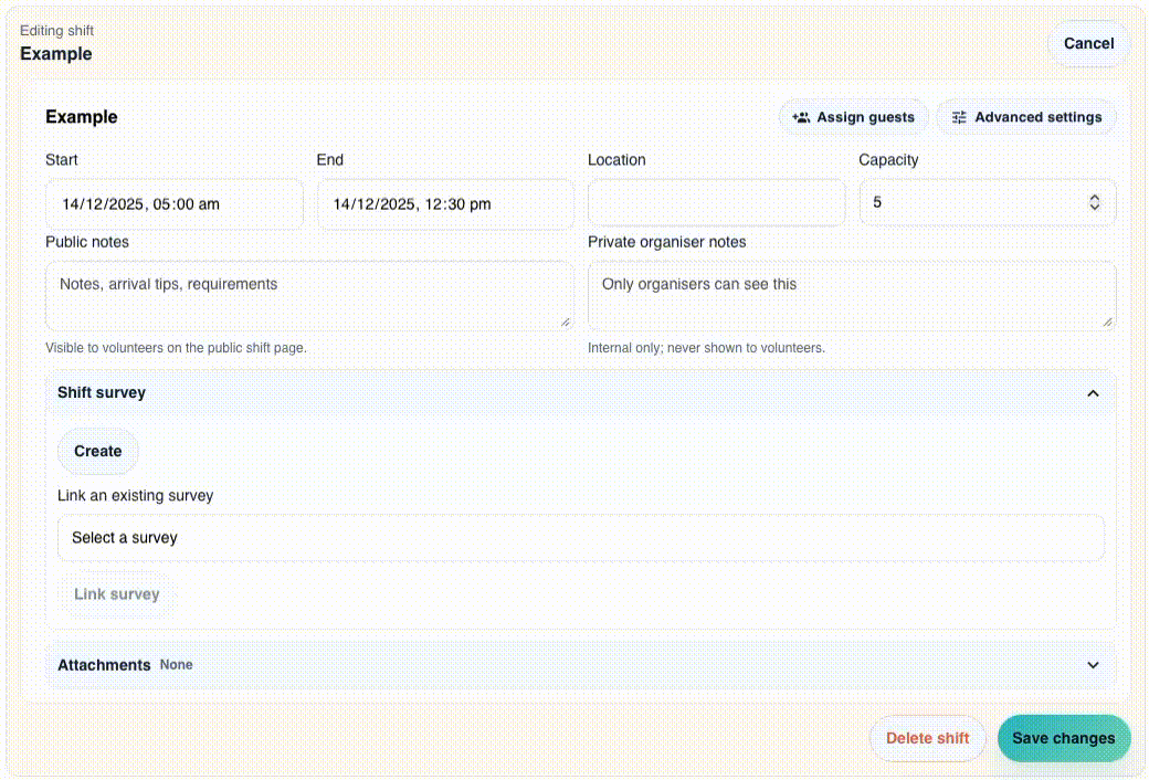 Shift surveys allow you to screen volunteers for a shift. This is very powerful when combined with the Requires approval advanced setting. To create one, go to an existing shift (or click on it if you're in the calendar view), and either link an existing survey or create a new one!